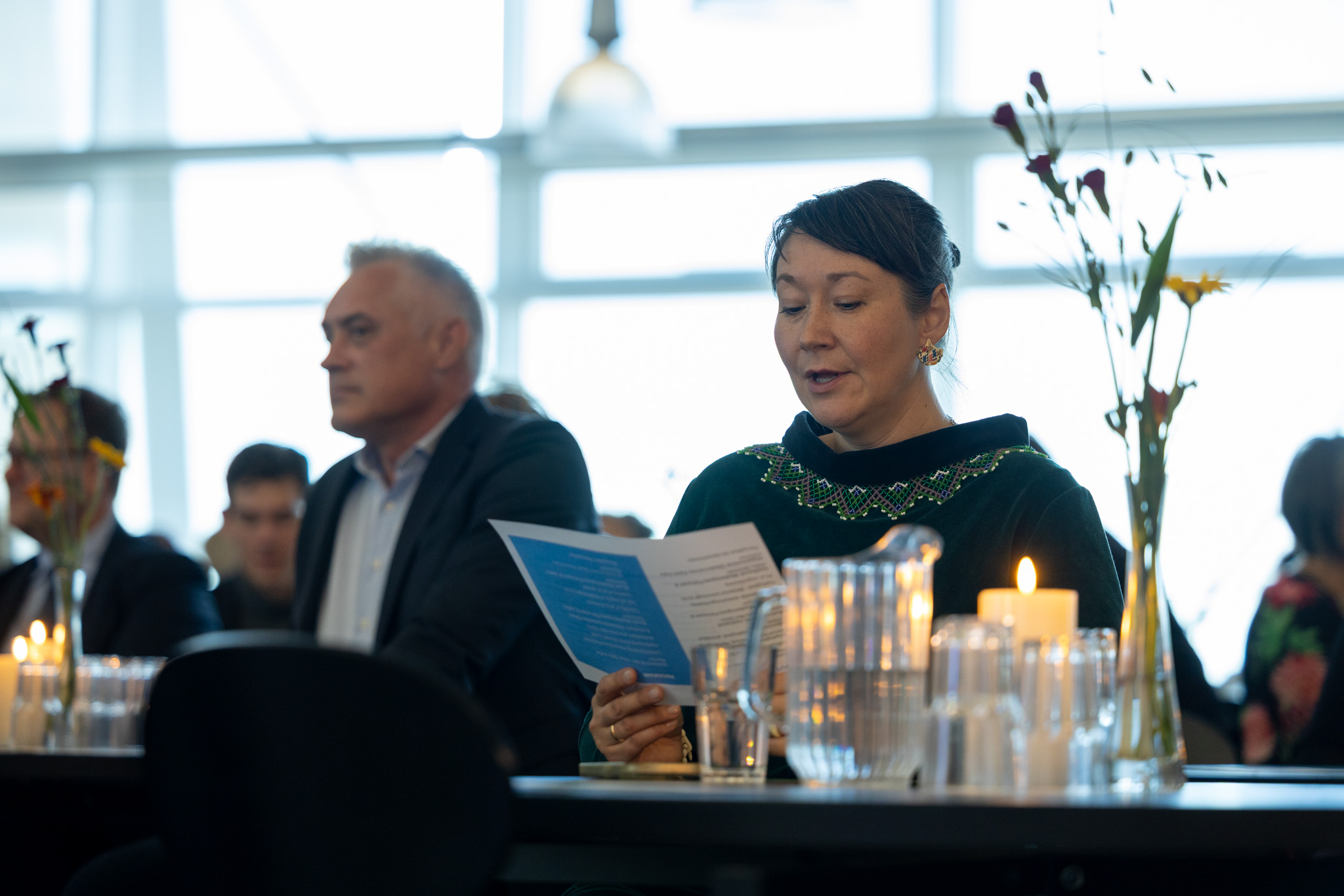 Rektor Gitte Adler Reimer åbnede Årsfesten med sin velkomststale, fulgt af årsfesttaler fra prorektor Mari Kleist, og Naalakkersuisoq for Uddannelse, Kultur, Idræt & Kirke, Nivi Olsen.