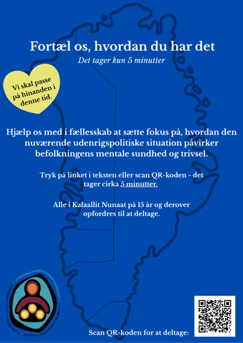 I forbindelse med Befolkningsundersøgelsen i Kalaallit Nunaat 2024–2026 gennemføres der nu en kort tillægsundersøgelse. Undersøgelsen skal give viden om befolkningens mentale sundhed og trivsel i en tid, hvor samfundet er under et ekstraordinært pres.